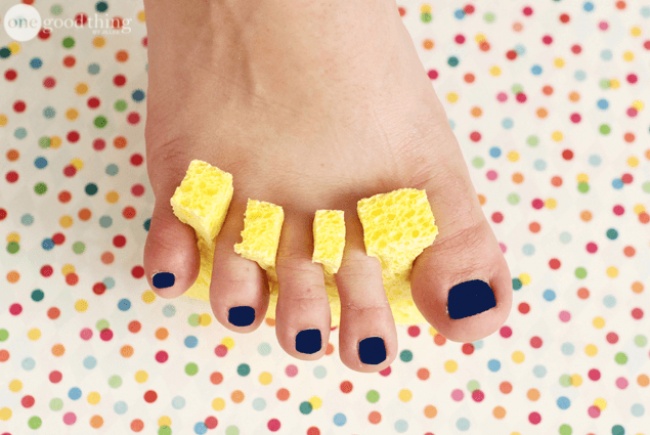 Κόψτε ένα σφουγγάρι σε λωρίδες και στη συνέχεια βάλτε τις ανάμεσα στα δάχτυλα των ποδιών για να βάψετε τα νύχια σας με ευκολία, χωρίς να έχετε ατυχήματα με το μανό.