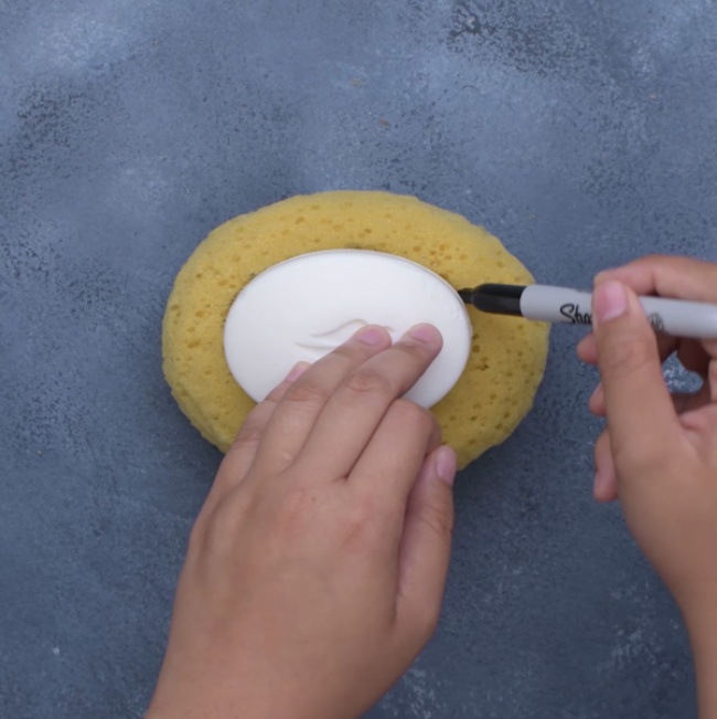 Φτιάξτε μια αδιάβροχη και… αντιολισθητική θήκη για το σαπούνι, κόβοντας προσεκτικά στη μέση του σφουγγαριού ένα οβάλ σχήμα, για να εφαρμόζει ακριβώς.