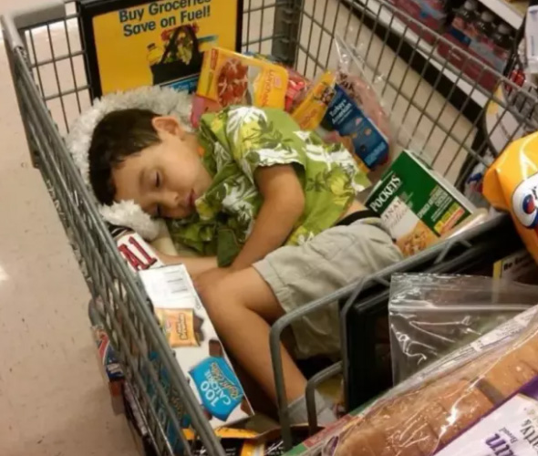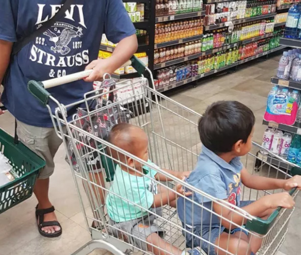 Το καρότσι καταλαμβάνεται από δύο παιδιά και ο μπαμπάς αναγκάζεται να κουβαλάει και καλάθι.