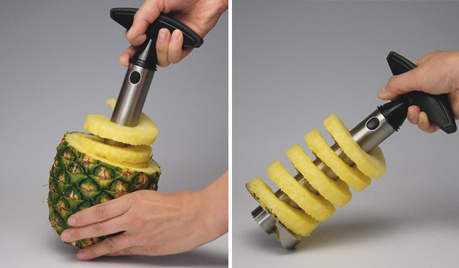 Το μόνο που θα χρειαστεί να κάνετε είναι να κόψετε προσεκτικά την κορυφή του. Έπειτα, εφαρμόστε το εργαλείο στο κέντρο του ανανά, στριφογυρίστε το μέχρι να φτάσει στο τέρμα του και τραβήξτε το πάλι πίσω.