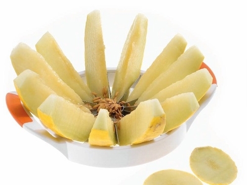 Με μία κίνηση, απλώς πιέζοντας τον κόφτη από πάνω προς τα κάτω, έχετε έτοιμες και κομμένες 12 ίσες φέτες του αγαπημένου σας φρούτου. Το συγκεκριμένο μοντέλο έχει μεγάλη διάμετρο, 24 εκατοστών, για να «πιάνει» και τα πιο μεγάλα φρούτα.