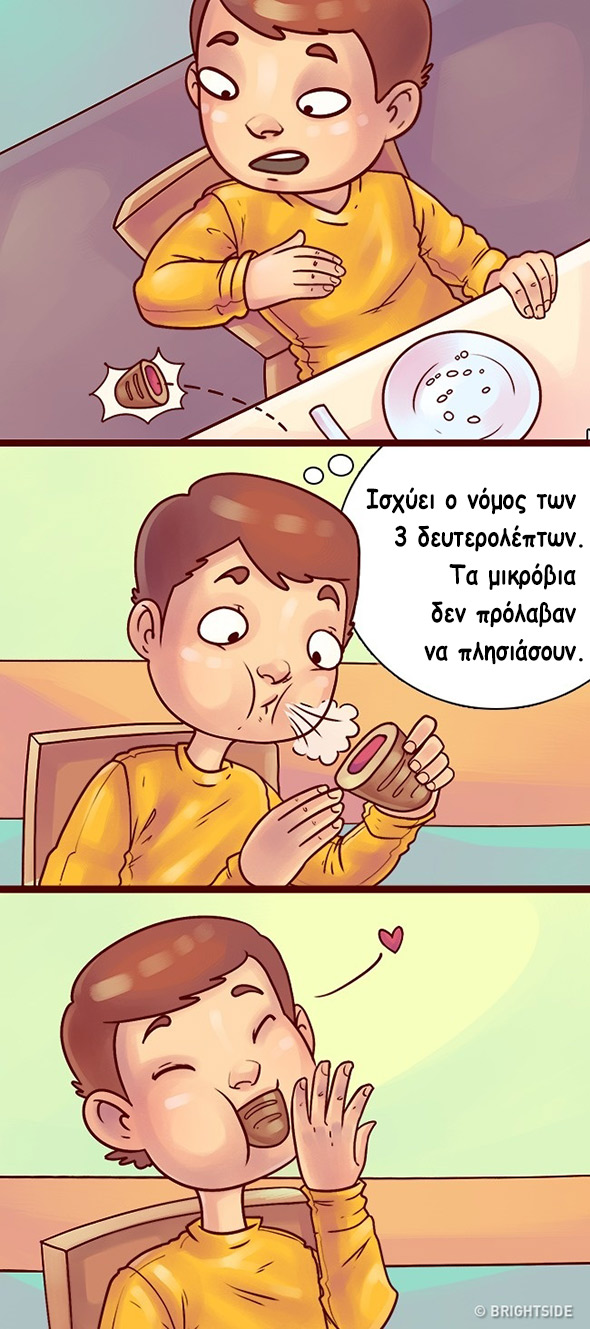 Αν πιάσεις αυτή τη μία μπουκιά που έπεσε στο πάτωμα μέσα 3 δευτερόλεπτα, μπορείς να τη φας άφοβα: είναι κανόνας που εφαρμόζεται πάντα και παντού, εκτός αν είσαι με κόσμο.