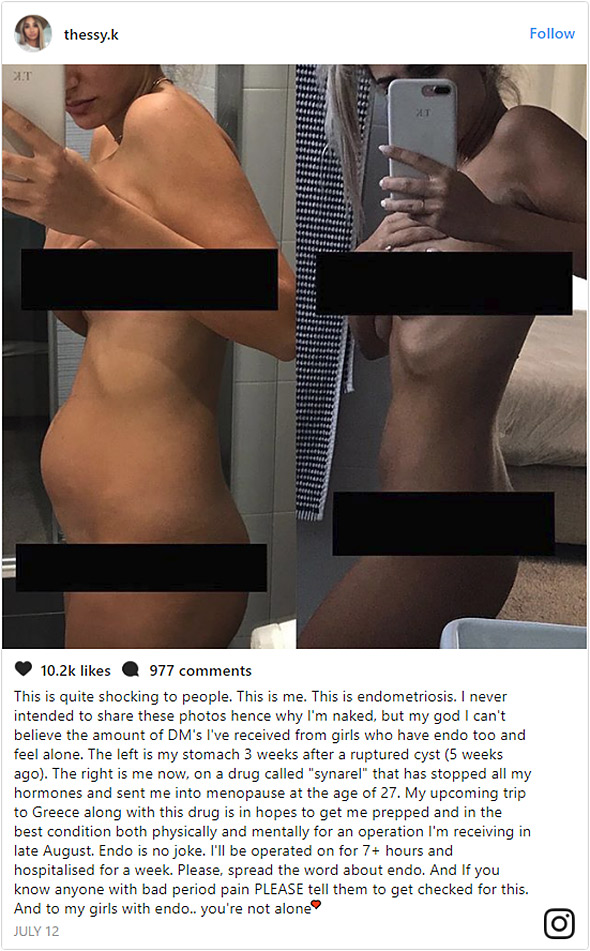 «Αυτό μπορεί να σοκάρει αρκετούς. Έτσι είμαι εγώ. Έτσι είναι η ενδομητρίωση. Δεν είχα σκοπό να μοιραστώ με τόσο κόσμο τις φωτογραφίες μου, γι’ αυτό και είμαι γυμνή, αλλά δεν μπορώ να πιστέψω πόσες κοπέλες περνάνε το ίδιο και νιώθουν μόνες. Έτσι ήταν το στομάχι μου πριν 3 εβδομάδες (αριστερή φώτο), ενώ 2 βδομάδες πριν τραβήξω τη φωτογραφία, είχα υποστεί ρήξη κύστης (κατά την οποία η κύστη σπάει και απελευθερώνει το υγρό της). Έτσι, είμαι εγώ τώρα (δεξιά φώτο). Παίρνω ένα ειδικό χάπι που έχει σταματήσει όλες μου τις ορμόνες, με αποτέλεσμα να είμαι 27 ετών και να έχω μπει στην εμμηνόπαυση. Το επερχόμενο ταξίδι μου στην Ελλάδα, μαζί με την αγωγή που ακολουθώ, ελπίζω να με προετοιμάσουν με τον καλύτερο δυνατό τρόπο για την επέμβαση που θα κάνω στα τέλη Αυγούστου. Η ενδομητρίωση δεν είναι αστείο. Θα με χειρουργούν για πάνω από 7 ώρες και θα μείνω στο νοσοκομείο μία βδομάδα. Σας παρακαλώ, διαδώστε τι είναι η ενδομητρίωση. Αν κάποια γνωστή σας υποφέρει από πόνους περιόδου, πείτε της να το κοιτάξει. Και σε όσες από εσάς έχετε ήδη ενδομητρίωση, να ξέρετε ότι δεν είστε μόνες!»