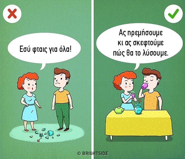 Είναι λάθος να μετατρέπεται ένας τσακωμός σε ντιμπέιτ για το ποιος έχει το περισσότερο φταίξιμο. Ο καυγάς έχει ήδη ξεκινήσει και –εφόσον είναι καυγάς- τότε προφανώς συμμετέχετε κι οι δυο. Προσπαθήστε να επενδύσετε τον κόπο και τον χρόνο που ξοδεύετε στο «ποιος το ξεκίνησε» σε κάτι χρησιμότερο.