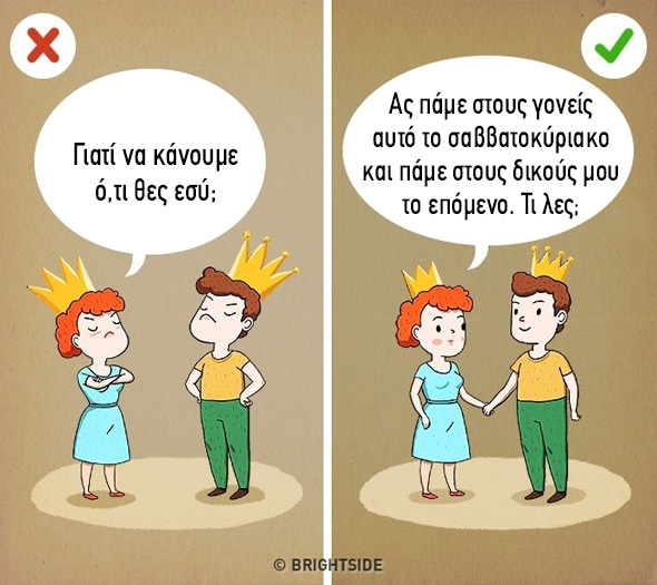 Αντί να ασκήσετε κριτική στο ταίρι σας ξεκινώντας με πικρόχολες φράσεις όπως «Εσύ ποτέ δεν…» ή «Πάντα είσαι…», προτιμήστε να κριτικάρετε την συμπεριφορά δίνοντας έμφαση στο τι σας ενοχλεί. Είναι εντελώς διαφορετικό για έναν άνθρωπο (εκνευρισμένο) ν’ ακούει «Κοιτάζεις πάντα μόνο τον εαυτό σου» από «Όταν συμπεριφέρεσαι με εγωισμό, στεναχωριέμαι».