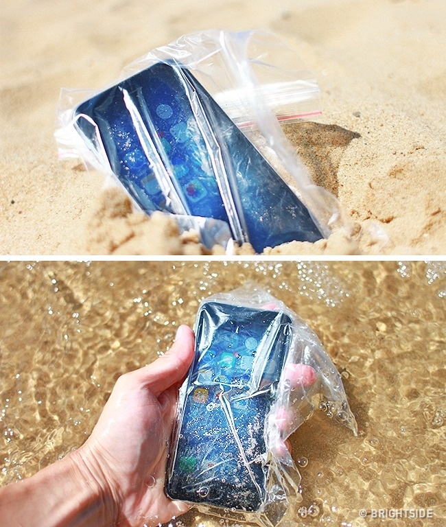 Για να προστατεύσετε το κινητό σας από την άμμο και το νερό, βάλτε το σε μια σακούλα ζίπερ. Έπειτα, αφαιρέστε τον αέρα και κλείστε την. Είναι η ιδανική αλλά και πιο οικονομική προστασία, αν δεν θέλετε να χαλάσετε χρήματα σε ακριβές αδιάβροχες θήκες.