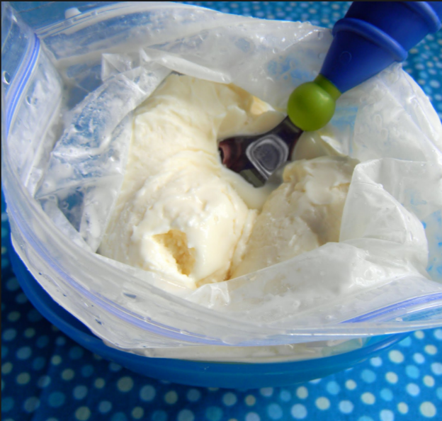 Μπορείτε να φτιάξετε το δικό σας παγωτό και μάλιστα να το διατηρήσετε στο ψυγειάκι της παραλίας. Θα χρειαστείτε 1 φλιτζάνι γάλα, 1 ½ κουταλιές της σούπας ζάχαρη, μισή κουταλιά της σούπας βανίλια, 2-3 φλιτζάνια παγάκια, 1/3 φλιτζανιού χοντρό αλάτι, 1 πλαστική σακούλα τροφίμων με ζίπερ και 1 μεγάλη σακούλα τροφίμων με ζίπερ για την κατάψυξη. Θα το φτιάξετε ως εξής: στη μικρή σακούλα ανακατέψτε το γάλα, τη βανίλια και τη ζάχαρη. Κλείστε την καλά και βεβαιωθείτε ότι έχετε απομακρύνει τον αέρα. Στη μεγάλη σακούλα, αναμίξτε το αλάτι και τον πάγο.