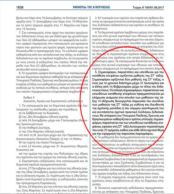 «Σημαιοφόροι, παραστάτες και υπεύθυνοι για την κατάθεση στεφάνου ορίζονται μαθητές της ΣΤ΄ τάξης. Σημαιοφόροι ορίζονται δύο μαθητές της ΣΤ’ τάξης, o ένας για το χρονικό διάστημα μέχρι 31 Ιανουαρίου και o άλλος από 1η Φεβρουαρίου μέχρι το τέλος του διδακτικού έτους. Η επιλογή σημαιοφόρων, παραστατών και υπευθύνων κατάθεσης στεφάνου πραγματοποιείται με κλήρωση ανάμεσα στο σύνολο των μαθητών της τάξης.