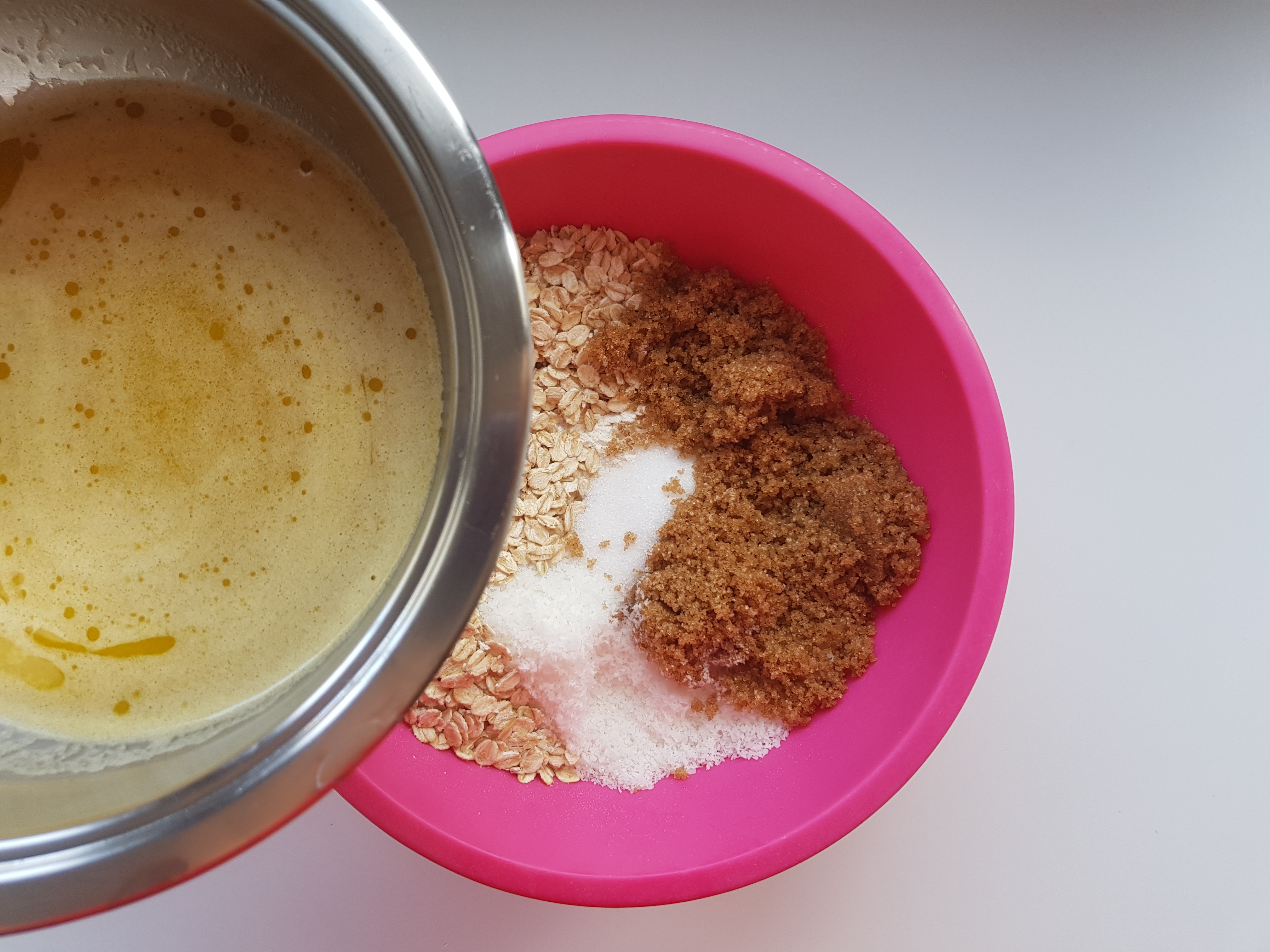 Σε ένα μεγάλο μπολ βάζετε το αλεύρι, το ινδοκάρυδο την καστανή και τη λευκή ζάχαρη.