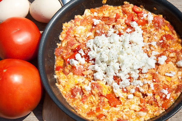 Ρίξτε το ελαιόλαδο σε ένα μεγάλο τηγάνι και βάλτε την ένταση του ματιού σε δυνατή φωτιά. Όταν το λάδι «κάψει», προσθέστε τις ντομάτες, τη ζάχαρη και το αλατοπίπερο και ανακατέψτε καλά. Φροντίστε, ωστόσο, να μην το παρακάνετε με το αλάτι γιατί η φέτα είναι ήδη αρκετά αλμυρή. Μόλις οι ντομάτες αρχίζουν να βράζουν, μειώστε την ένταση της φωτιάς και ανακατέψτε για 10- 15 λεπτά, μέχρι ο χυμός τους να εξατμιστεί.