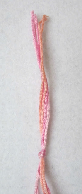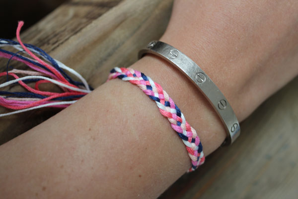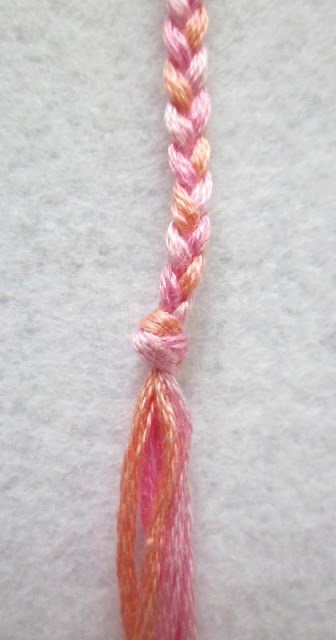 Αρχικά, πάρτε την μία εξωτερική κλωστή (την μπλε της φωτογραφίας), περάστε την κάτω από την επόμενη (την φούξια) και μετά πάνω από την διπλανή της (τη ροζ).
