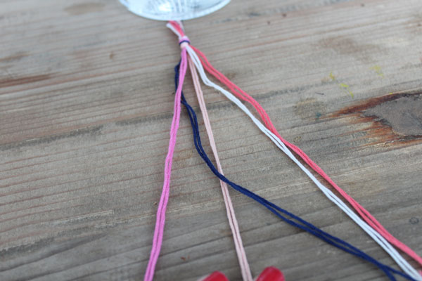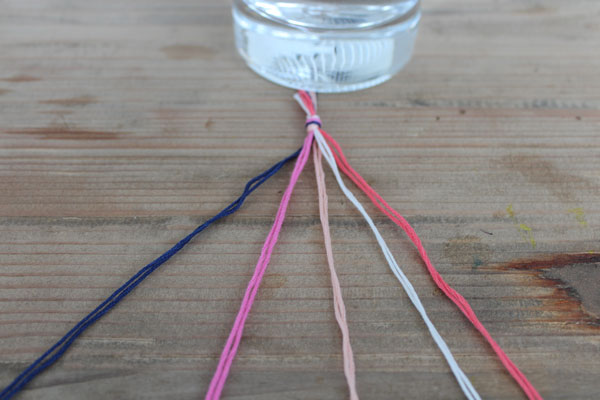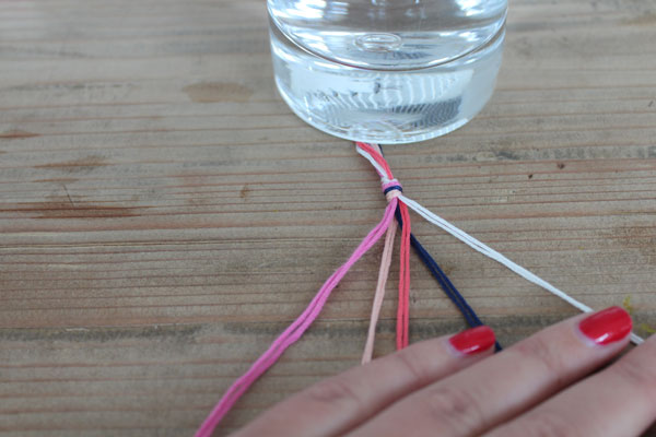 Απλώστε τις κλωστές δίπλα δίπλα και φτιάξτε έναν μικρό κόμπο αρκετά εκατοστά πριν το τέλος -μην τον κάνετε στην άκρη γιατί θα το χρησιμοποιήσετε για να στερεώσετε το βραχιολάκι στον καρπό σας.