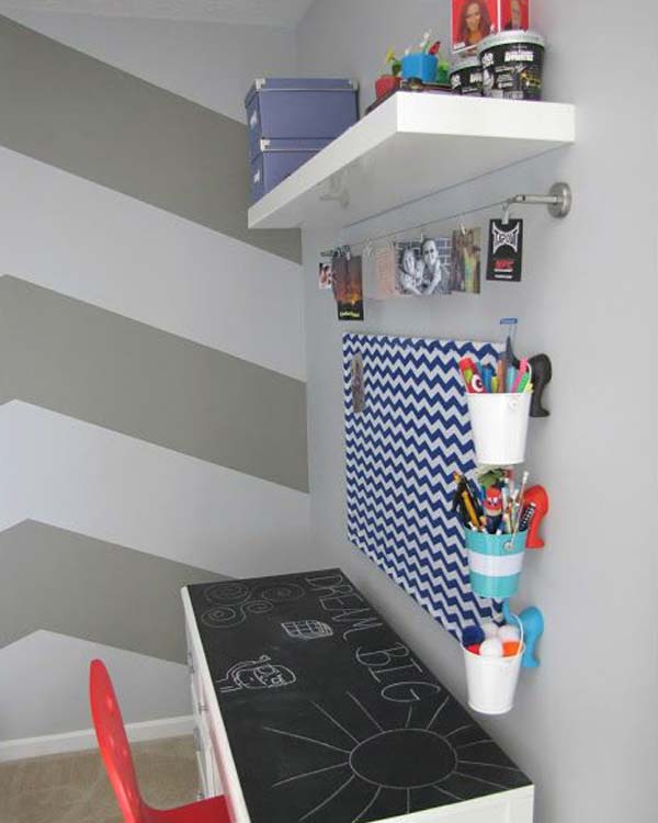 Ντύστε το γραφείο με αυτοκόλλητο μαυροπίνακα για να γράφει το παιδί και εκεί όταν θέλει. Όταν δεν τον χρησιμοποιεί, απλώς καλύψτε το.