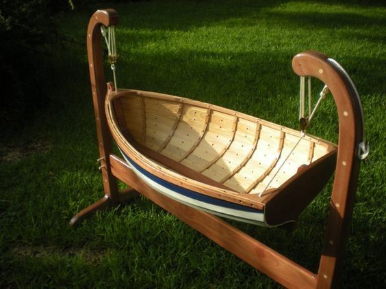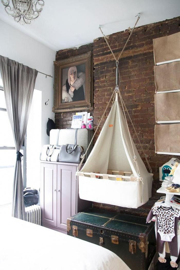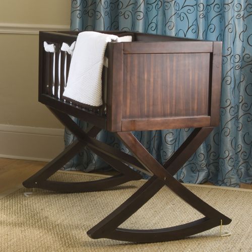 Λίκνο από σκούρο ξύλο για ένα ρουστίκ βρεφικό δωμάτιο