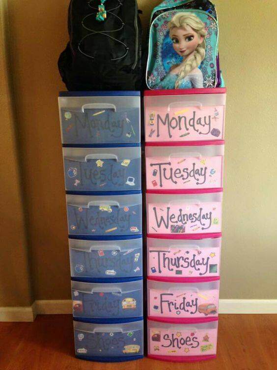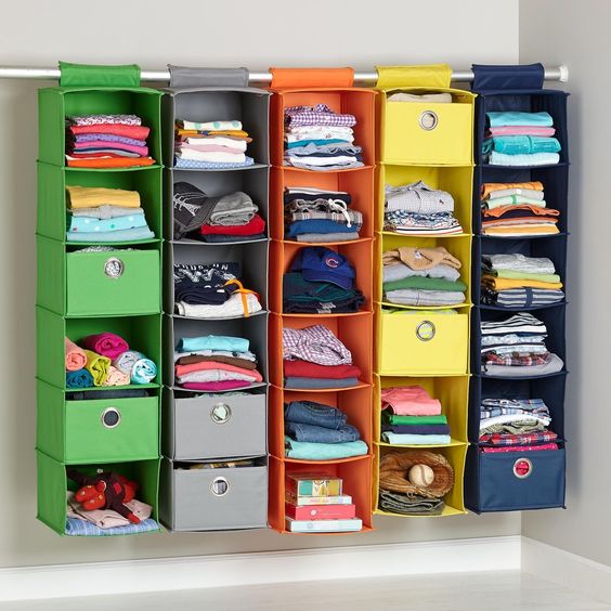 Για να διαχωρίσετε τα ρούχα τους, χρησιμοποιήστε πολυώροφες κάθετες θήκες σε διαφορετικό χρώμα για το κάθε παιδί.