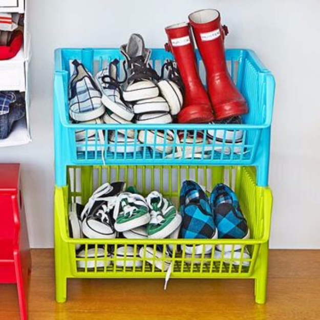 Για τα παπούτσια, μπορείτε να χρησιμοποιήσετε τις κλασικές ραφιέρες για τα φρούτα, βάφοντας τον κάθε όροφο σε διαφορετικό χρώμα.