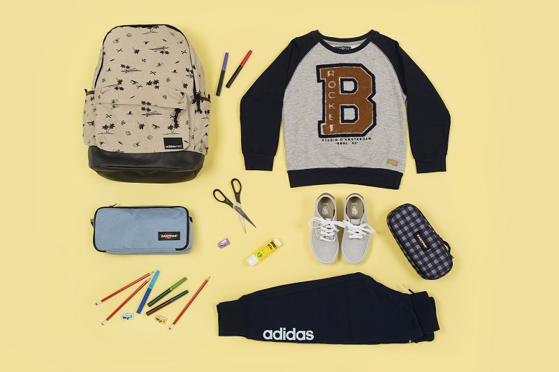 Aγόρι: Adidas Backpack από €34.95 - €19.95, κασετίνα καρό Eastpak από €18 - €11, παπούτσια Vans από €50 - €30, φούτερ Marasil από €29.90 - €14.60, φόρμα Adidas από €29.95 - €17.95.
