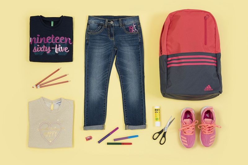 Koρίτσι: φούτερ μπλε Benetton από €24.95 - €16.20, φούτερ μπεζ Marasil από €29.90 - €14.95, τζιν Benetton από €29.95 - €19.40, αθλητικά Adidas από €69.95 – 44.95, backpack Adidas από €24.95 – 14.95.