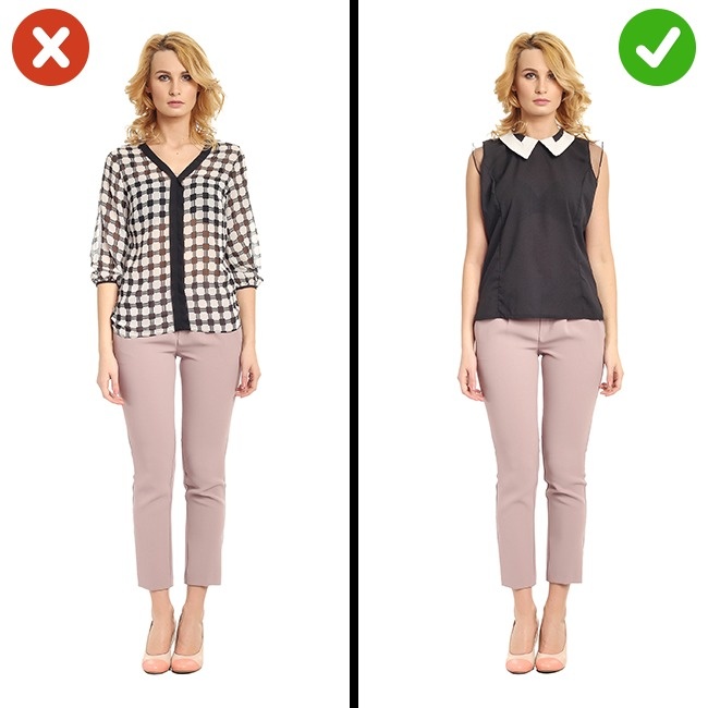 Aντίστοιχα, τα πολύ μεγάλα σχέδια στις μπλούζες δείχνουν τις περισσότερες γυναίκες πιο ευσώμες απ' ό,τι πραγματικά είναι, κάνοντας το σώμα τους να μοιάζει πιο «τετραγωνισμένο». Είναι προτιμότερο, να επιλέγετε μπλούζες μονόχρωμες με έντονους γιακάδες ή με χρωματιστές λεπτομέρειες στα μανίκια ή την περιοχή της ζώνης, που θα αφαιρέσουν κιλά απ' τη μέση.