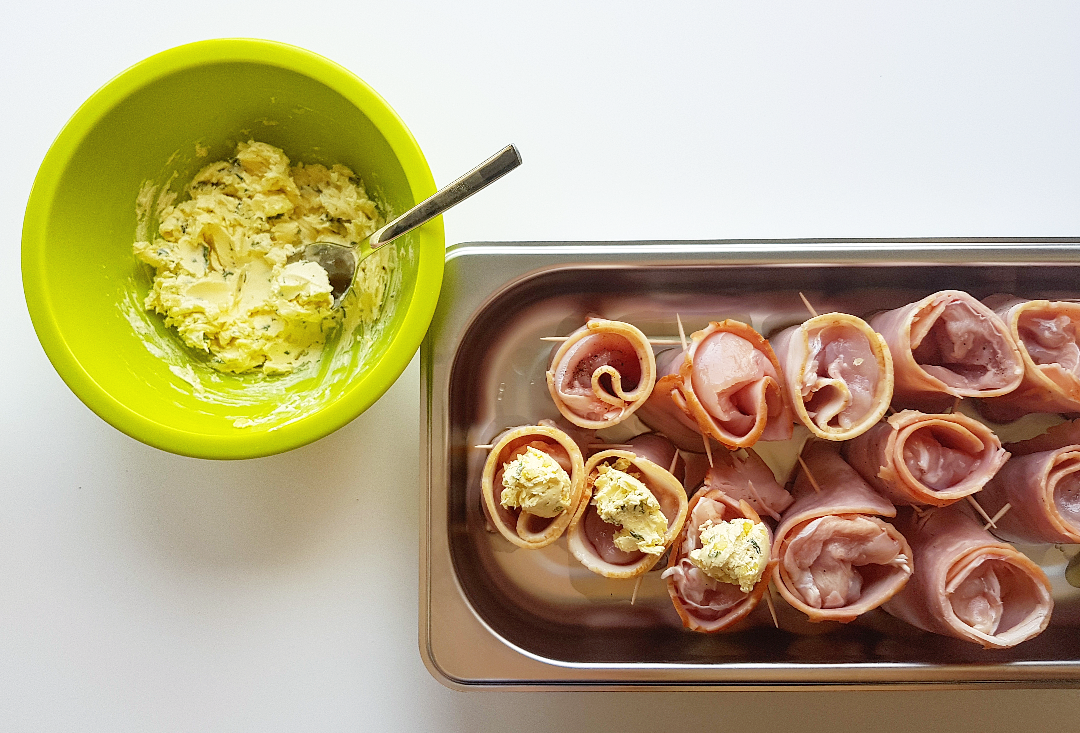 Λαδώστε ένα μικρό ταψάκι φούρνου και τοποθετήστε τα ρολάκια. Βάλτε στο καθένα μια μικρή ποσότητα σκορδοβούτυρου.