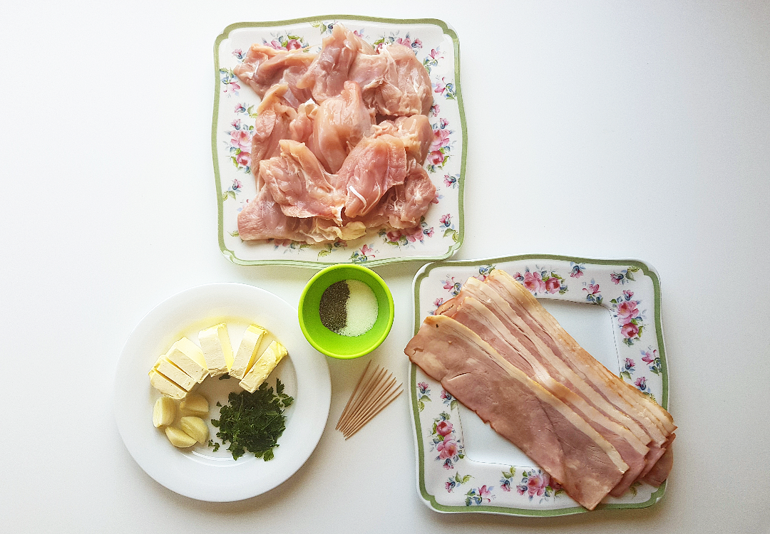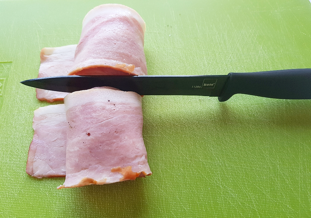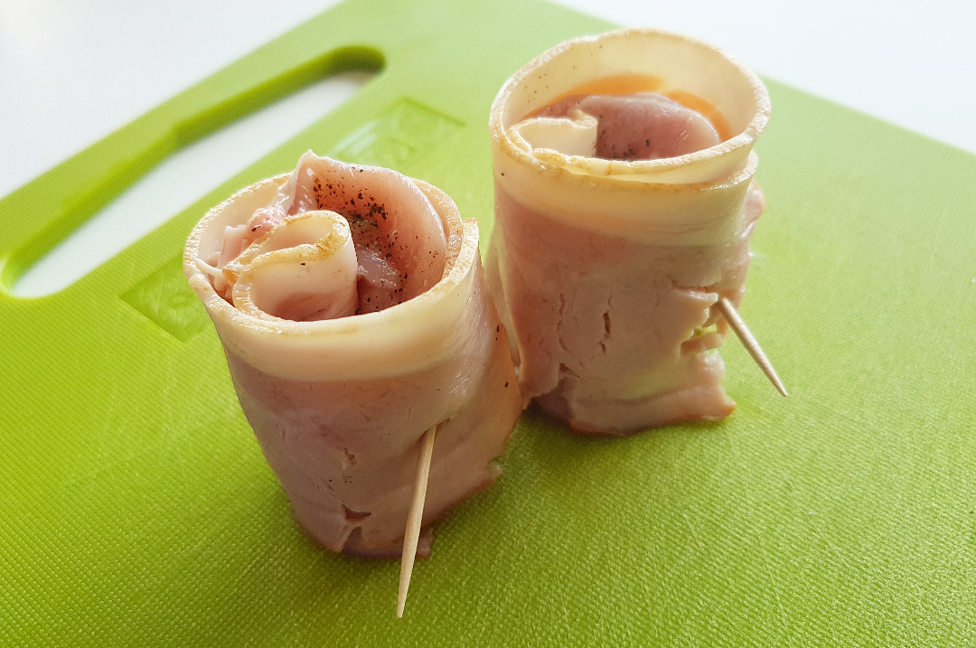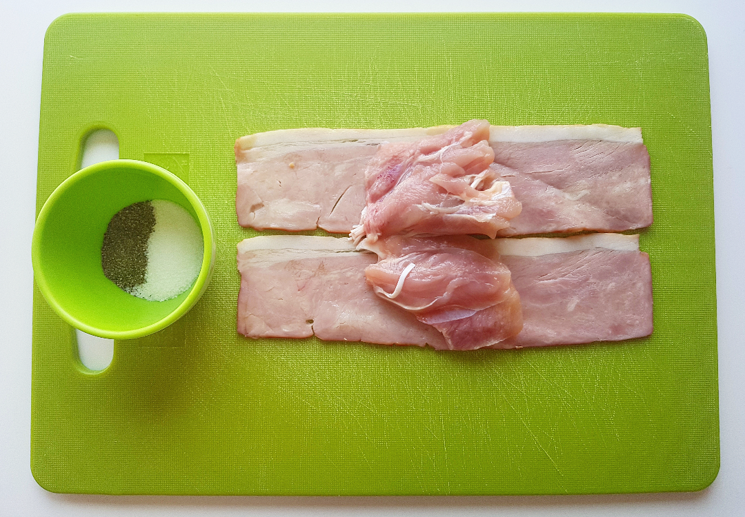 Στρώστε δύο φέτες μπέικον σε ένα ξύλο/πλαστικό κοπής.
