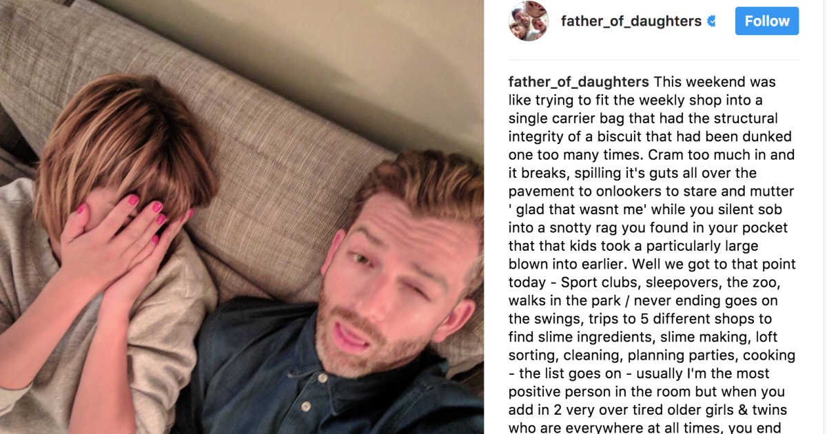 Σήμερα, φτάσαμε σ’ αυτό το σημείο –πήγαμε στον ζωολογικό κήπο, κάναμε βόλτα στο πάρκο, κάτσαμε με τις ώρες στις κούνιες, πήγαμε σε 5 διαφορετικά μαγαζιά για να βρούμε όλα όσα χρειάζονταν τα παιδιά. Καθαρίσαμε, οργανώσαμε πάρτι, μαγειρέψαμε και η λίστα συνεχίζεται. Συνήθως είμαι πολύ αισιόδοξος αλλά όταν προσθέσεις 2 κουρασμένα κορίτσια και τα δίδυμα που είναι πάντα παντού, το αποτέλεσμα είναι δύο γονείς που τα 'χουν παίξει. Τα μάτια μου είναι τόσο κουρασμένα που αναγκάζομαι να τα ανοιγοκλείνω συνέχεια και οι γυναίκες που με βλέπουν στον δρόμο νομίζουν ότι τους κλείνω το μάτι πονηρά. Πρέπει να είμαστε λιγότερο αυστηροί με τον εαυτό μας και να θυμόμαστε πως κάνουμε ό,τι καλύτερο μπορούμε. Νιώθει κανείς άλλος ακριβώς το ίδιο; Είμαι τόσο κουρασμένος που θα μπορούσα ναzzzzzzzzzzzzz.»
