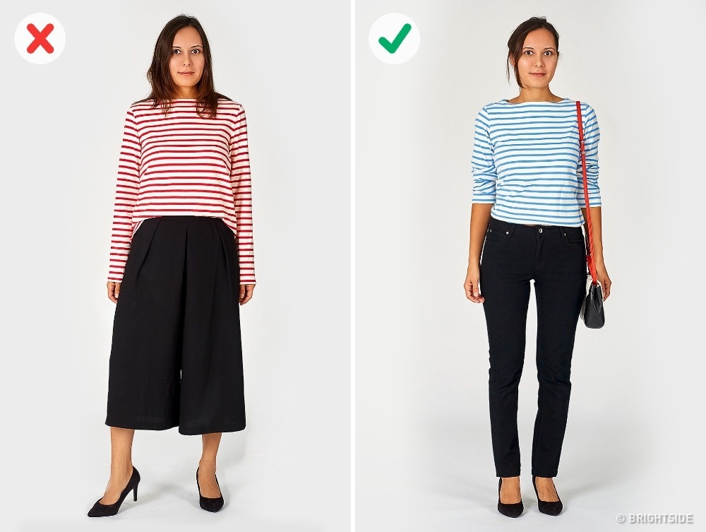 Τα οριζόντια σχέδια δίνουν την εντύπωση μιας πιο «γεμάτης» σιλουέτας, προσθέτοντάς σας κιλά χωρίς λόγο. Αυτό δεν σημαίνει ότι πρέπει να επιλέγετε μόνο τις σίγουρες μονοχρωμίες. Τα κάθετα σχέδια θα επιμηκύνουν τον κορμό σας, δίνοντάς σας ύψος.
