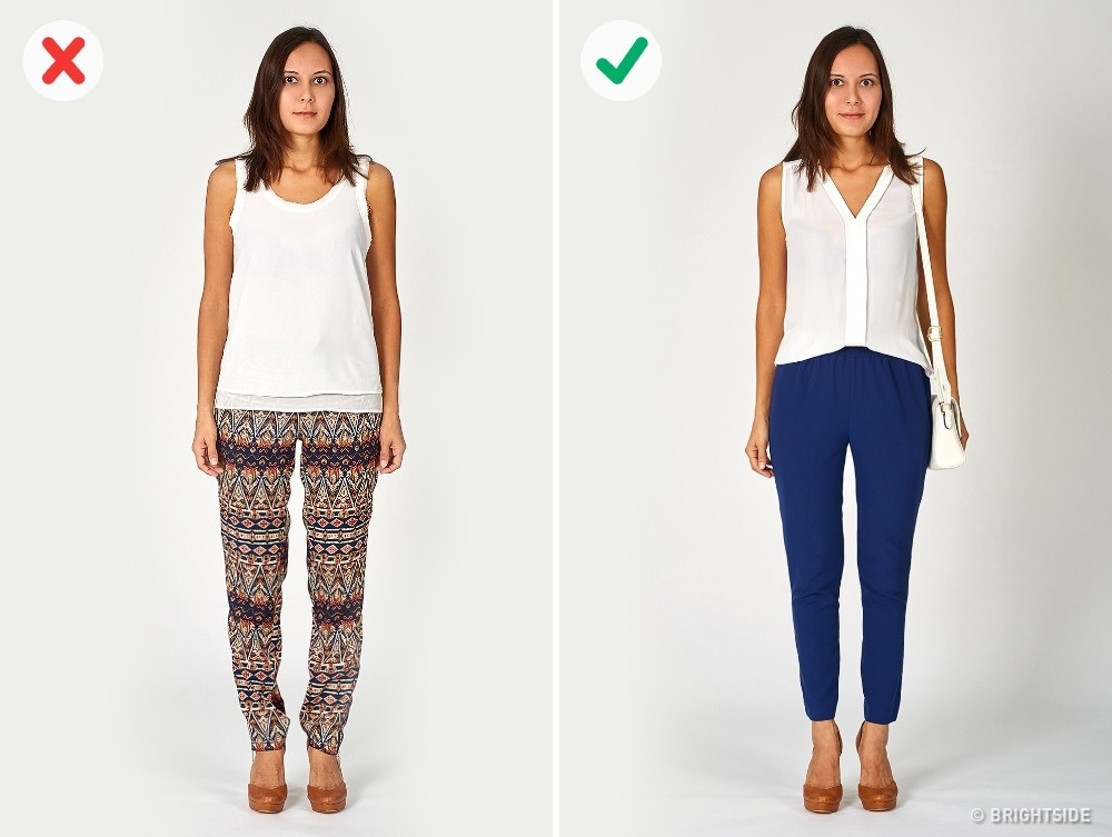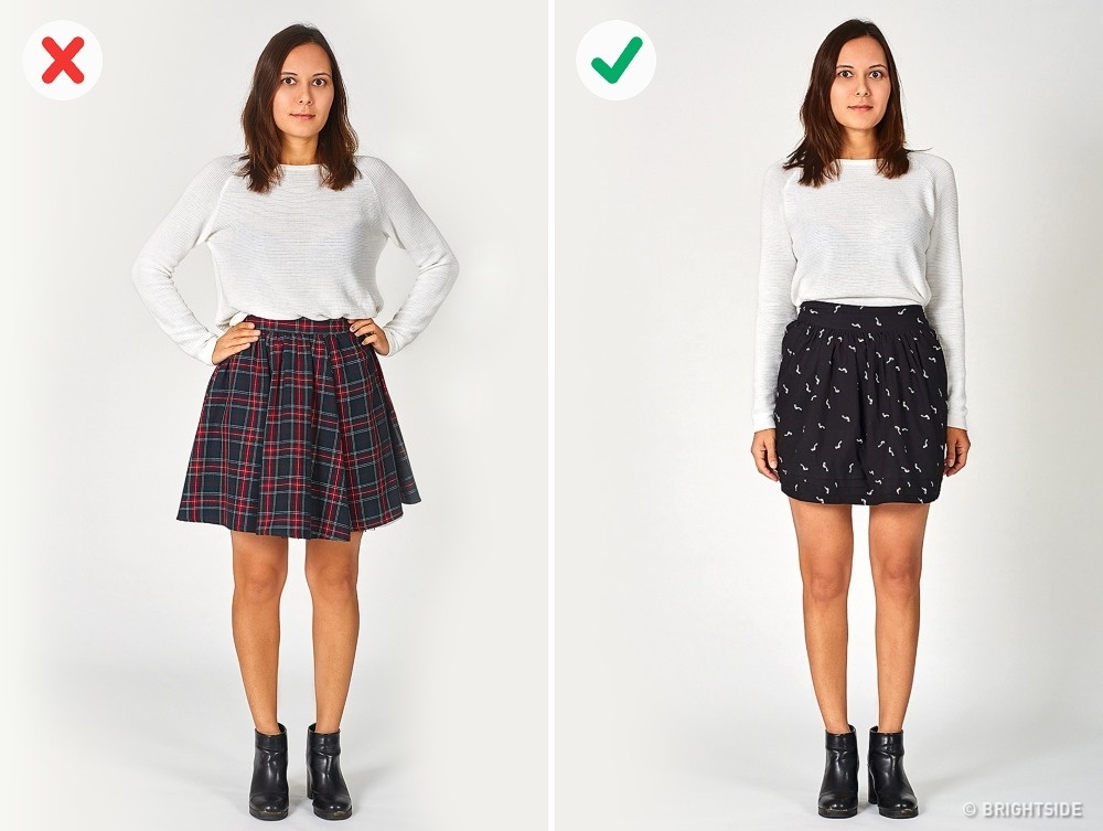 Τα ρούχα που έχουν μεγάλα τετράγωνα σχέδια μπορούν να κάνουν τη σιλουέτα σας να φαίνεται άτσαλη. Ειδικά οι φούστες, τα παντελόνια και τα σορτσάκια μ’ αυτό το μοτίβο, θα κάνουν την περιφέρειά σας να φαίνεται πιο ανοιχτή, ακόμα κι αν έχετε στενή λεκάνη. Προτιμήστε τα πιο μικρά και διακριτικά σχέδια που, αν έχουν και το σωστό κόψιμο, θα σας κάνουν να φαίνεστε ψηλόλιγνη.