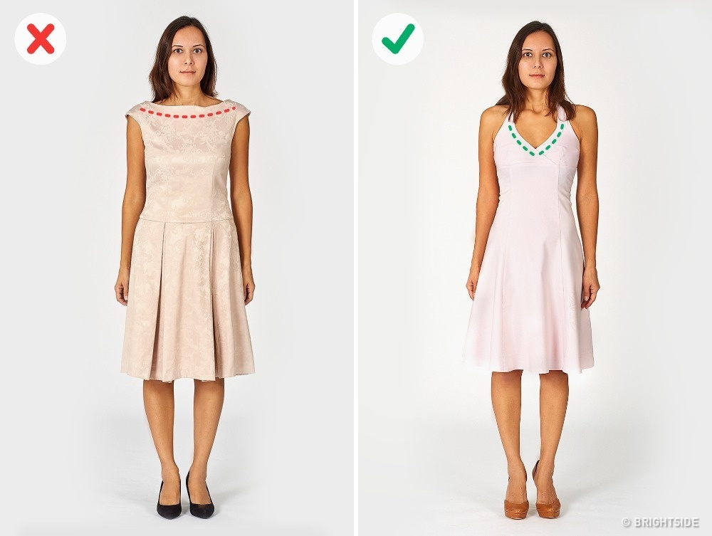 Η λαιμόκοψη χαμόγελο «ανοίγει» τον θώρακα και κάνει τους ώμους σας να φαίνονται πιο φαρδείς. Αντίθετα, η λαιμόκοψη-V κολακεύει το μπούστο και σας κάνει να φαίνεστε πολύ κομψή.