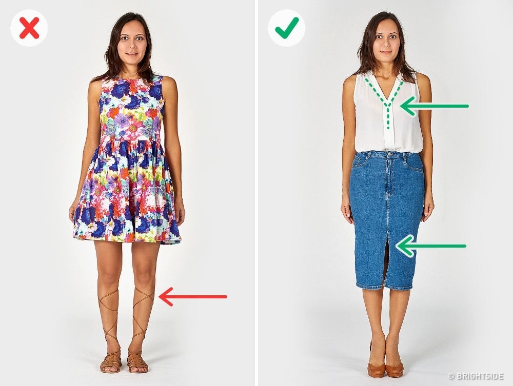 Τα μεγάλα μοτίβα που απλώνονται οριζόντια φαρδαίνουν την περιφέρεια και προσθέτουν κιλά. Αν συνδυαστούν, μάλιστα, με περίεργα παπούτσια που «κόβουν» τα πόδια, το αποτέλεσμα μπορεί να είναι… καταστροφικό για τη σιλουέτα σας. Αντίθετα, μια λαιμόκοψη- V και ένα μικρό σκίσιμο στη pencil φούστα, θα ευθυγραμμίσουν τον κορμό σας και θα σας κάνουν να φαίνεστε αρκετά ψηλότερη.