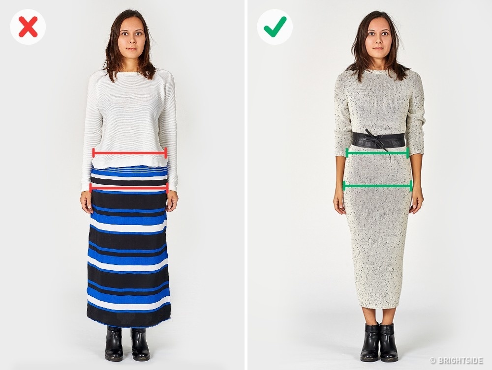 … που κάνουν το σώμα να φαίνεται άγαρμπο και μονοκόμματο. Αντίθετα, μια μονόχρωμη μακριά φούστα ή φόρεμα, που αγκαλιάζουν τη μέση και το σώμα, μαζί με μια φαρδιά μαύρη ζώνη, που ταιριάζει με όλα τα χρώματα, θα αναδείξουν τις θηλυκές καμπύλες σας.