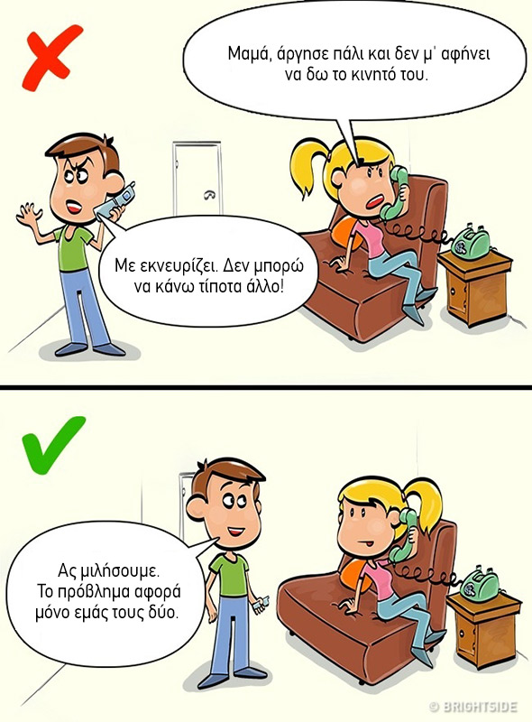 Η διαφωνία με τον σύντροφό σας αφορά μόνο εσάς τους δύο και κανέναν άλλον. Το να «μπλέκετε» στην κουβέντα γονείς, αδέρφια, ξαδέρφια, κολλητές και λοιπούς άλλους που φυσικά συμφωνούν μαζί σας, είναι μια λανθασμένη πρακτική. Εκτός του ότι στρέφεστε εσείς κι η οικογένειά σας εναντίον του, αυθαίρετα μοιράζεστε μαζί τους τα προσωπικά σας προβλήματα που δεν αφορούν μόνο εσάς, αλλά και τον άνθρωπο που επιλέξατε να έχετε δίπλα σας.