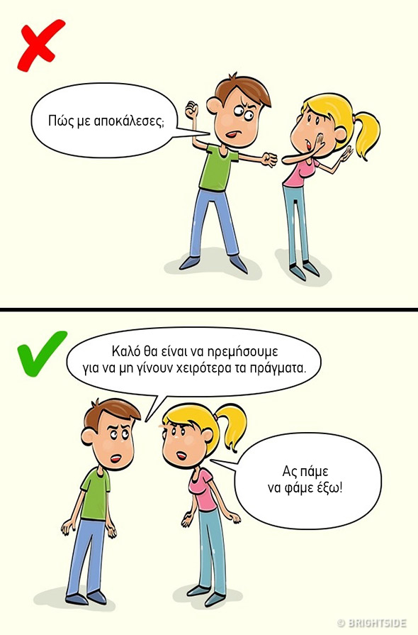 Όταν μαλώνουμε, δείχνουμε τον χειρότερό μας εαυτό- κάποιοι μπορεί ακόμα και να καταφύγουν στη βία. Δεν θα πρέπει να επιτρέψετε ούτε στον σύντροφο αλλά ούτε και στον εαυτό σας να γίνετε επιθετικοί. Αν δείτε ότι η κατάσταση ξεφεύγει, βρείτε έναν τρόπο να αποφορτιστείτε- ακόμα και μια απλή βόλτα έξω απ’ το σπίτι μπορεί να βοηθήσει και τους δυο σας.