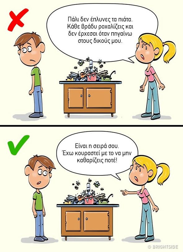 Αν έχετε παράπονα για το ότι ο σύντροφός σας δεν σας βοηθάει στις δουλειές του σπιτιού, μείνετε σ’ αυτά. Μην χρησιμοποιήσετε σαν αφορμή το ότι δεν πλένει ποτέ τα πιάτα για να τον κατηγορήσετε και για ό,τι άλλο έχετε… ραμμένο για τη γούνα του! Μ’ αυτόν τον τρόπο, μια απλή διαφωνία μπορεί να καταλήξει σ’ έναν μεγάλο καβγά που θα στιγματίσει τη σχέση σας.
