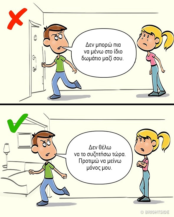 Αν νιώθετε ότι έχετε ανάγκη να σταματήσετε τον καβγά, το να φύγετε από το σπίτι χτυπώντας την πόρτα είναι ό,τι χειρότερο μπορείτε να κάνετε. Αντ’ αυτού, προτιμήστε να πείτε στον σύντροφό σας ότι θέλετε να μείνετε για λίγο μόνοι σε ένα άλλο δωμάτιο μέχρι να ηρεμήσετε και να μπορέσετε να συζητήσετε μετά με μεγαλύτερη ψυχραιμία.