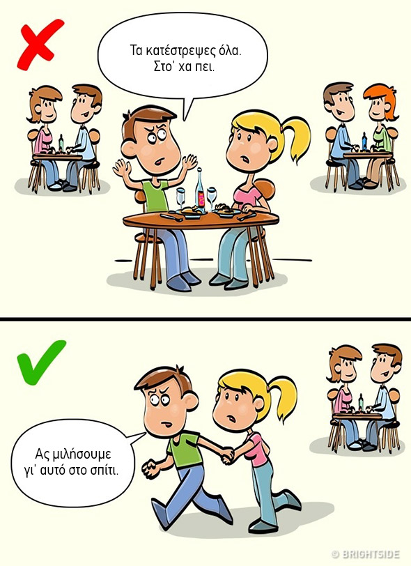 Αν αρχίσετε να διαφωνείτε σε δημόσιο χώρο ή μπροστά σε φίλους και γνωστούς, δείχνετε ότι δεν σέβεστε ούτε τον σύντροφό σας ούτε τον κόσμο δίπλα σας. Κάντε λίγη υπομονή και περιμένετε μέχρι να γυρίσετε σπίτι όπου μπορείτε να μιλήσετε ελεύθερα.