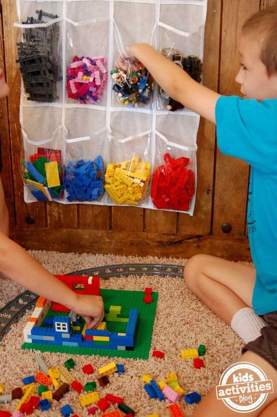 Κρεμάστε μια πλαστική θήκη αποθήκευσης μπάνιου στο δωμάτιο και βάλτε μέσα τα Lego.