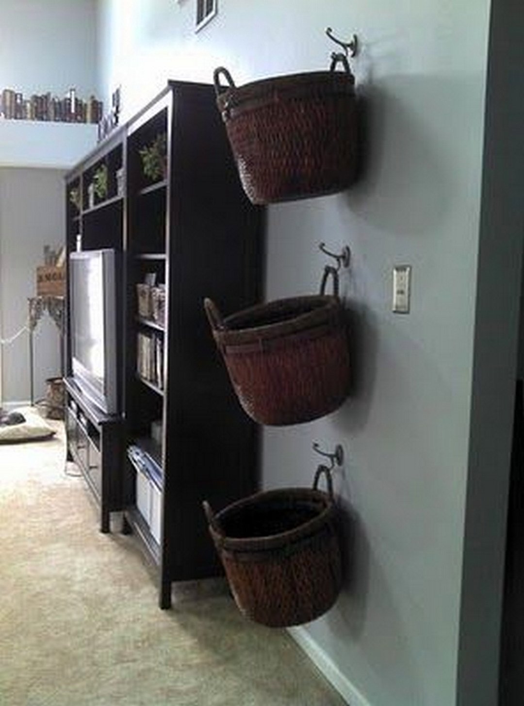 Κρεμάστε μεγάλα ψάθινα καλάθια στους τοίχους χρησιμοποιώντας κρεμάστρες ως γάντζους