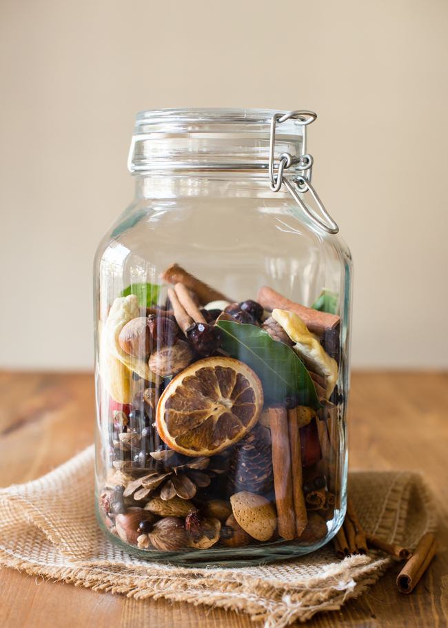 Χρησιμοποιήστε αποξηραμένες φέτες πορτοκαλιού, μήλου, φύλλα λουλουδιών, στικς κανέλας, κουκουνάρια, γαρύφαλλο. Βάλτε τα σε ένα βάζο, προσθέστε λίγες σταγόνες από ένα ή περισσότερα αιθέρια έλαια, ανακινήστε το για να ανακατευτούν τα αρώματα και στη συνέχεια βάλτε το περιεχόμενό του σε ένα μπολ στο κεντρικό τραπέζι του σαλονιού.