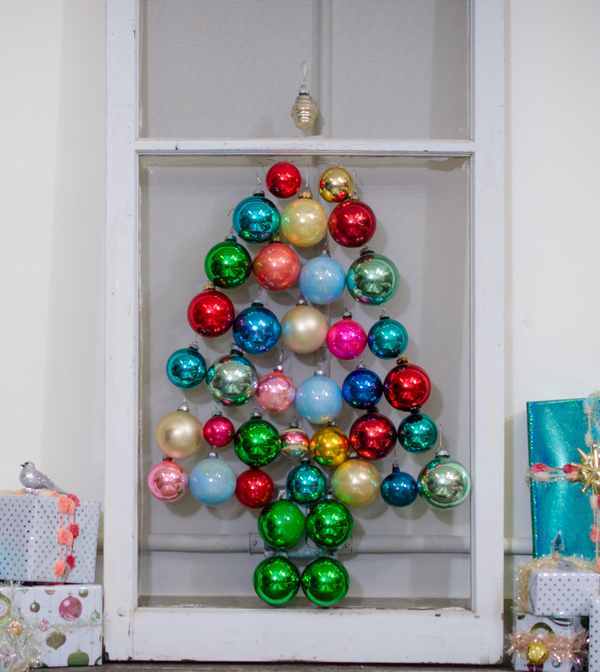 Σε ένα ξύλινο πλαίσιο με σίτα από παλιό παράθυρο, μπορείτε να σχηματίσετε ένα χριστουγεννιάτικο δέντρο από όλα τα στολίδια που περισσεύουν.