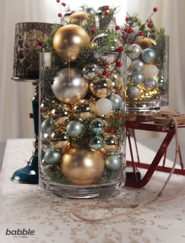 Ανακατέψτε στολίδια, μπάλες, γιρλάντες, φωτάκια και κλαδιά και βάλτε τα σε ένα γυάλινο βάζο για να φαίνεται ευκρινώς η σύνθεση που φτιάξατε.