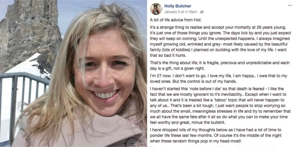 Είναι πολύ περίεργο να συνειδητοποιείς και να δέχεσαι ότι είσαι θνητός στα 26 σου χρόνια. Είναι ένα από εκείνα τα πράγματα που αγνοείς. Οι μέρες περνούν και εσύ απλώς δέχεσαι ότι ο χρόνος συνεχίζει έτσι: μέχρι να γίνει το αναπόφευκτο. Πάντα φανταζόμουν ότι θα γερνούσα, θα είχα ρυτίδες και θα είχα γκριζάρει, πιθανώς από την οικογένεια που θα είχα φτιάξει με τον άντρα της ζωής μου. Το θέλω τόσο πολύ αυτό, που με πονάει.