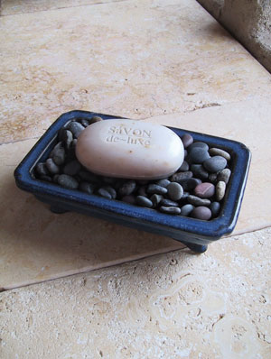 Πετάξτε την άσχημη, πλαστική θήκη του σαπουνιού κι αντικαταστήστε την με ένα μπολάκι γεμάτο πετρούλες
