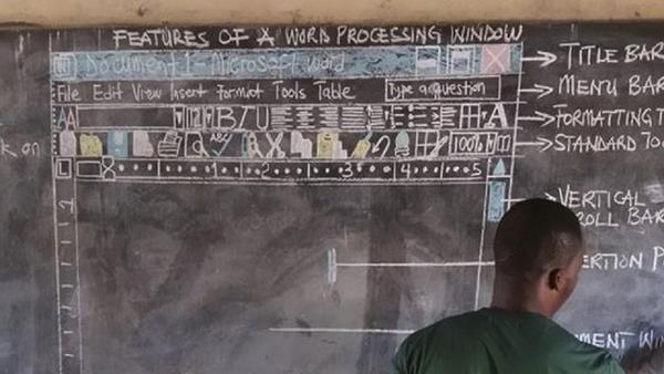 Ο 33χρονος δάσκαλος δουλεύει σε σχολείο σε μια αγροτική περιοχή κοντά στη Γκάνα, που διαθέτει τα απολύτως απαραίτητα μέσα για να κάνουν μάθημα τα παιδιά. Υπολογιστές δεν υπάρχουν κάτι που θα μας οδηγούσε στο συμπέρασμα ότι η διδασκαλία της Πληροφορικής είναι ακατόρθωτη. Ο Kwandwo, όμως, δεν το έβαλε κάτω και αποφάσισε να ζωγραφίσει στον κλασικό μαυροπίνακα ένα έγγραφο του Word με όλες τις επιλογές όπως θα εμφανίζονταν στην οθόνη ενός υπολογιστή- ένα εγχείρημα που του πήρε, ούτε λίγο ούτε πολύ, 70 ολόκληρα λεπτά.