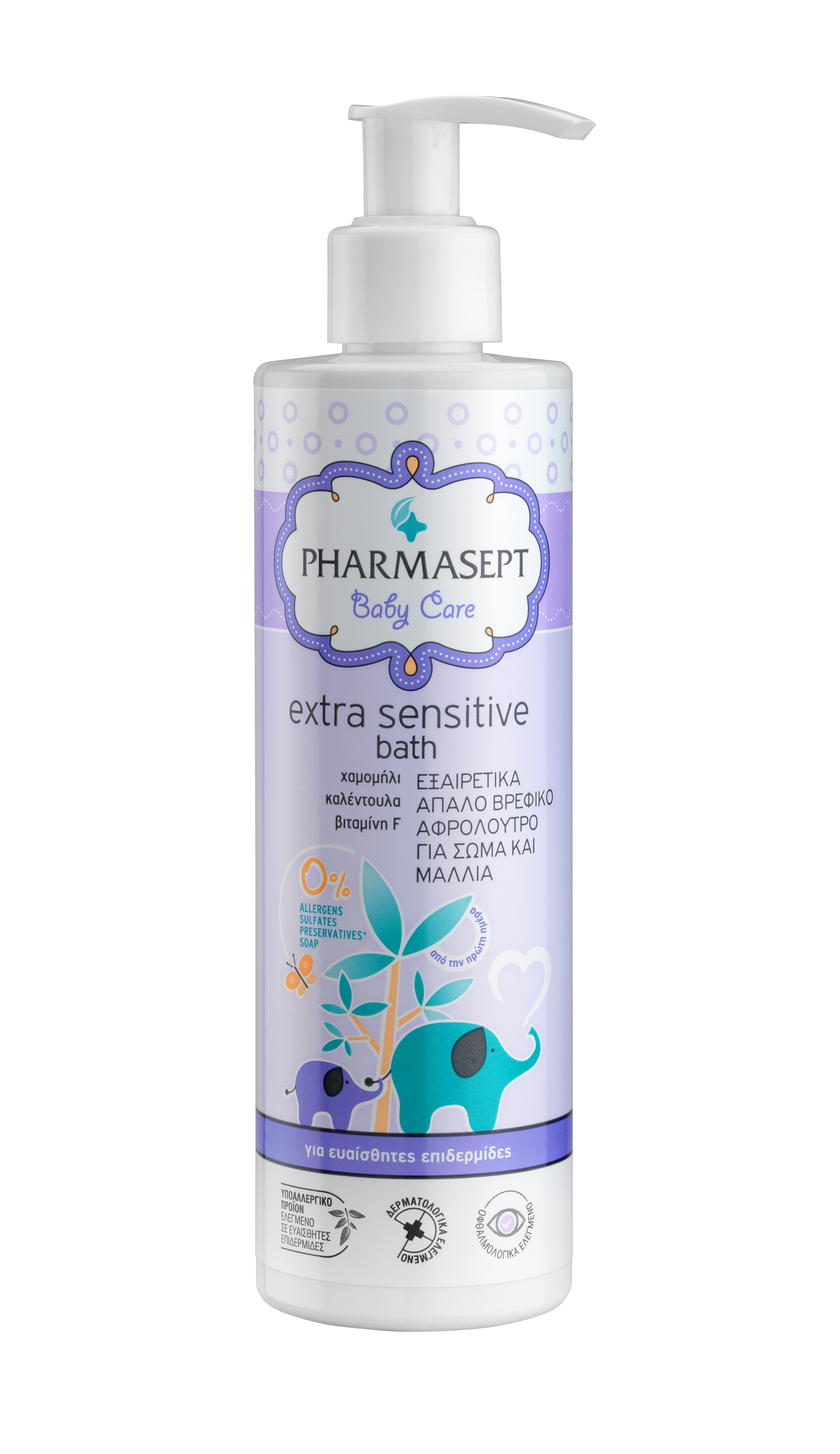 Το Baby Extra Sensitive Bath 250ml είναι ένα εξαιρετικά απαλό βρεφικό αφρόλουτρο για χρήση από την πρώτη κιόλας μέρα με ήπιους επιφανειοδραστικούς παράγοντες χωρίς σαπούνι και SLES/SLS, που καθαρίζουν χωρίς να διαταράσσουν τον υδρολιπιδικό φραγμό της ευαίσθητης βρεφικής επιδερμίδας. Περιέχει ενυδατικούς και καταπραϋντικούς παράγοντες, φυτικά εκχυλίσματα και βιταμίνες που θρέφουν και προστατεύουν το δέρμα του μωρού. Απαλλαγμένο από αλλεργιογόνα, parabens, συντηρητικά. Υποαλλεργικά και οφθαλμολογικά ελεγμένο.