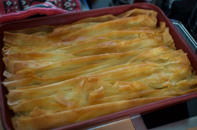Ανακατέψτε το μίγμα που φτιάξατε για λίγα λεπτά ακόμα και στη συνέχεια ρίξτε το πάνω στα φύλλα αργά. Πριν βάλετε την πίτα στο φούρνο, πασπαλίστε την με ροδόνερο.