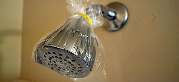 Το τηλέφωνο της ντουζιέρας μπορεί να νομίζουμε ότι δεν συσσωρεύει βρωμιά, όμως στην πραγματικότητα είναι πηγή μικροβίων και αλάτων. Για να το καθαρίσετε τώρα που θα κάνετε γενική, βάλτε σε μία πλαστική, διάφανη σακούλα μία κούπα λευκό ξύδι και δύο κουταλάκια της σούπας μαγειρική σόδα. Αφού τα αναμίξετε καλά, βάλτε τη σακούλα στο τηλέφωνο όπως φαίνεται στη φωτογραφία, δέστε την σφιχτά με σπάγκο και αφήστε το μίγμα να δράσει για μία νύχτα. Την επόμενη μέρα, το αφαιρείτε, ξεπλένετε και είστε έτοιμοι.