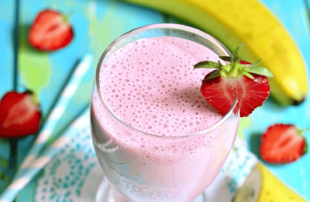 Βάλτε στο μπλέντερ 1 ώριμη μπανάνα, 1 φλιτζάνι φράουλες, 1 άπαχο γιαούρτι με γεύση φράουλα, ½ ποτήρι γάλα 1,5% λιπαρά και 2 μπισκότα πτι μπερ ολικής άλεσης. Ανακατέψτε καλά και σερβίρετε μ’ ένα πολύχρωμο καλαμάκι.
