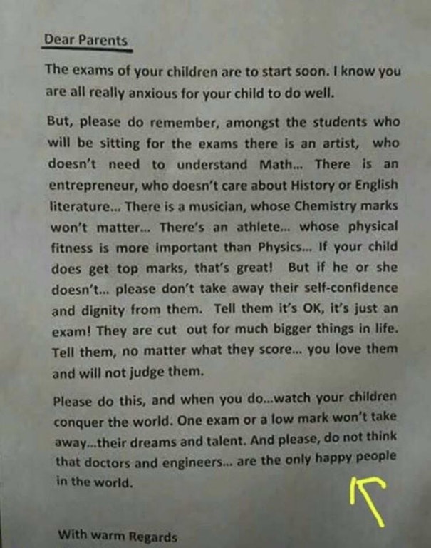 Οι εξετάσεις θα αρχίσουν σε λίγες μέρες. Ξέρω ότι αγχώνεστε για το αν θα τα πάει καλά το παιδί σας. Αλλά, σας παρακαλώ, να θυμάστε το εξής: ανάμεσα στους μαθητές που θα δίνουν εξετάσεις, θα κάθεται ένας καλλιτέχνης που δεν έχει ανάγκη τα Μαθηματικά. Ένας επιχειρηματίας που δεν τον ενδιαφέρει η Ιστορία ή η Λογοτεχνία. Ένας μουσικός, που δεν νοιάζεται για τους βαθμούς που θα πάρει στη Χημεία. Ένας αθλητής, για τον οποίο η καλή φυσική κατάσταση είναι πολύ πιο σημαντική από τη Φυσική. Αν τα παιδιά σας πάρουν καλούς βαθμούς, μπράβο! Αν πάλι δεν τα πάνε καλά, μην τα υποτιμήσετε και μην τους στερήσετε την αξιοπρέπειά τους. Πείτε τους ότι είναι όλα καλά, ότι είναι απλώς μια εξέταση. Στη ζωή θα κριθούν για πολύ μεγαλύτερα πράγματα από αυτό. Πείτε τους πόσο τα αγαπάτε και πως δεν θα τα κρίνετε, ανεξάρτητα από τους βαθμούς που θα πάρουν. Σας παρακαλώ, θυμηθείτε να τους το πείτε και όταν το κάνετε, δείτε τα παιδιά σας να κατακτούν τον κόσμο. Μία εξέταση και ένας χαμηλός βαθμός δεν θα διώξουν τα όνειρα και το ταλέντο τους. Και σας παρακαλώ, μην νομίζετε πως οι γιατροί και οι μηχανικοί είναι οι μόνοι ευτυχισμένοι άνθρωποι στον κόσμο».