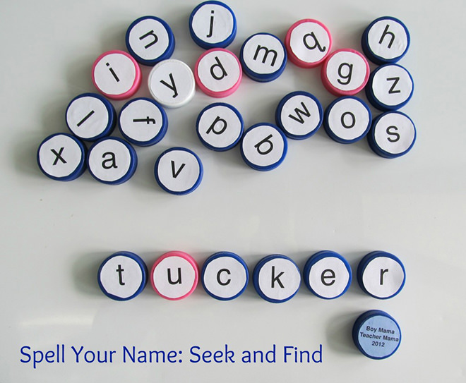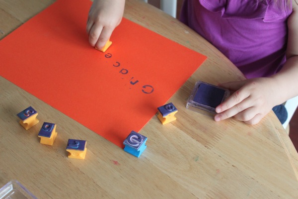 Πάρτε σφραγίδες με τα γράμματα του ονόματός του, σχηματίστε το αρχικά εσείς σε ένα κομμάτι χαρτί και έπειτα αφήστε το να ακολουθήσει το παράδειγμά σας.